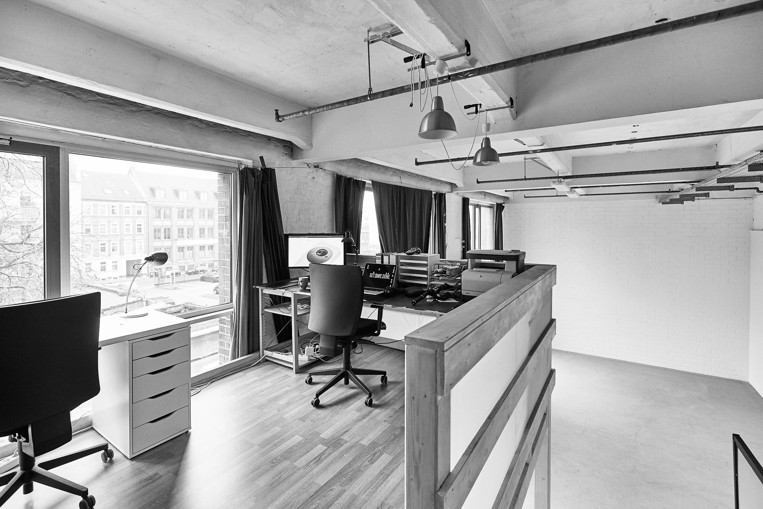 Hier befinden sich drei vollwertige Schreibtische, die während der Produktion genutzt werden können – zum Beispiel für Bildauswahl, Schnitt, Kundenabnahmen, Produktion oder Regie. Damit lassen sich Set und Organisation sauber trennen, ohne den Workflow zu stören. Gerade für Agenturen ein echter Vorteil.
